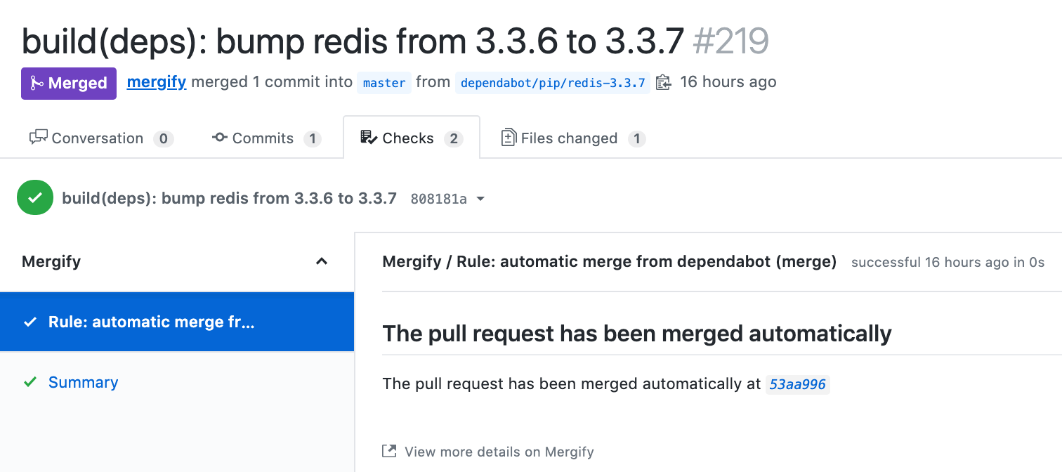 If anything goes wrong, you’re still able to revert the commit from Dependabot — which you can also automate if you wish with a Mergify rule.