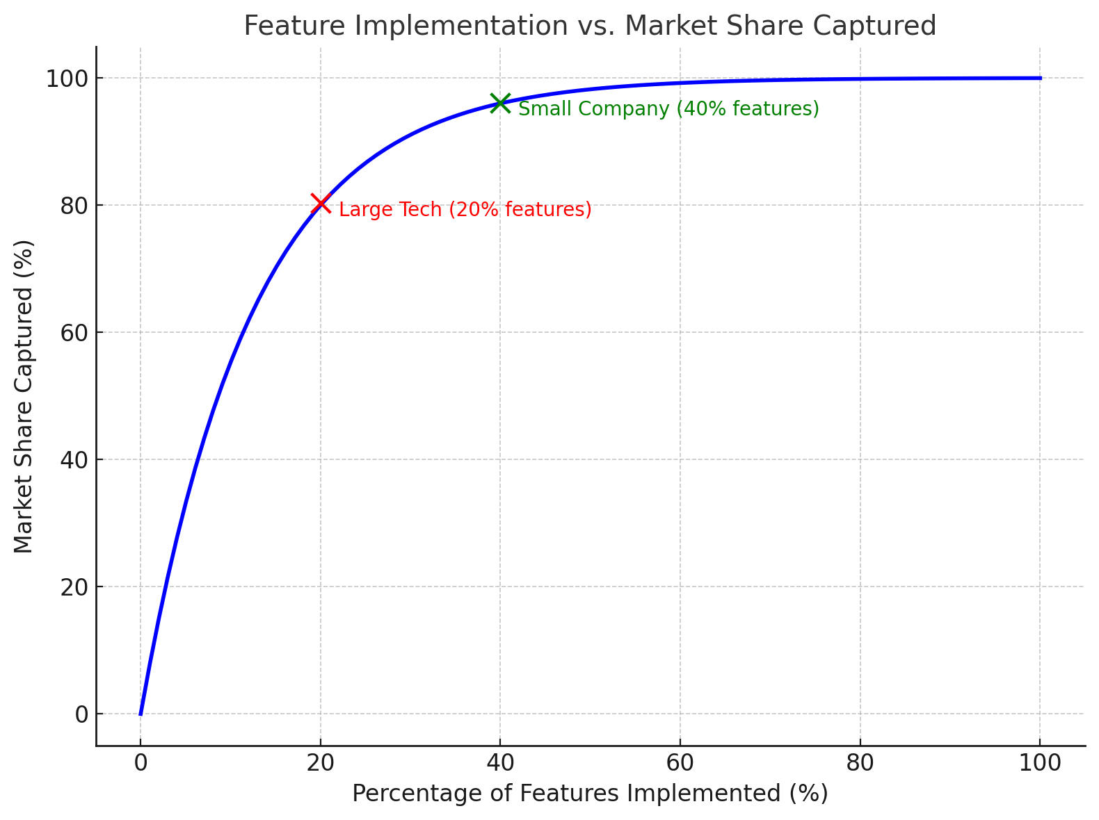 A small company that builds beyond the basic 20% and focuses on solving complex or specialized problems can appeal to customers who require more tailored solutions, thus capturing a large share of a more focused market. While large companies serve the general market, small players can dominate specialized verticals. By implementing, e.g., 40% of the features for a particular scope, you could address 97% of the market, thus appearing as an expert and leader in your area.
