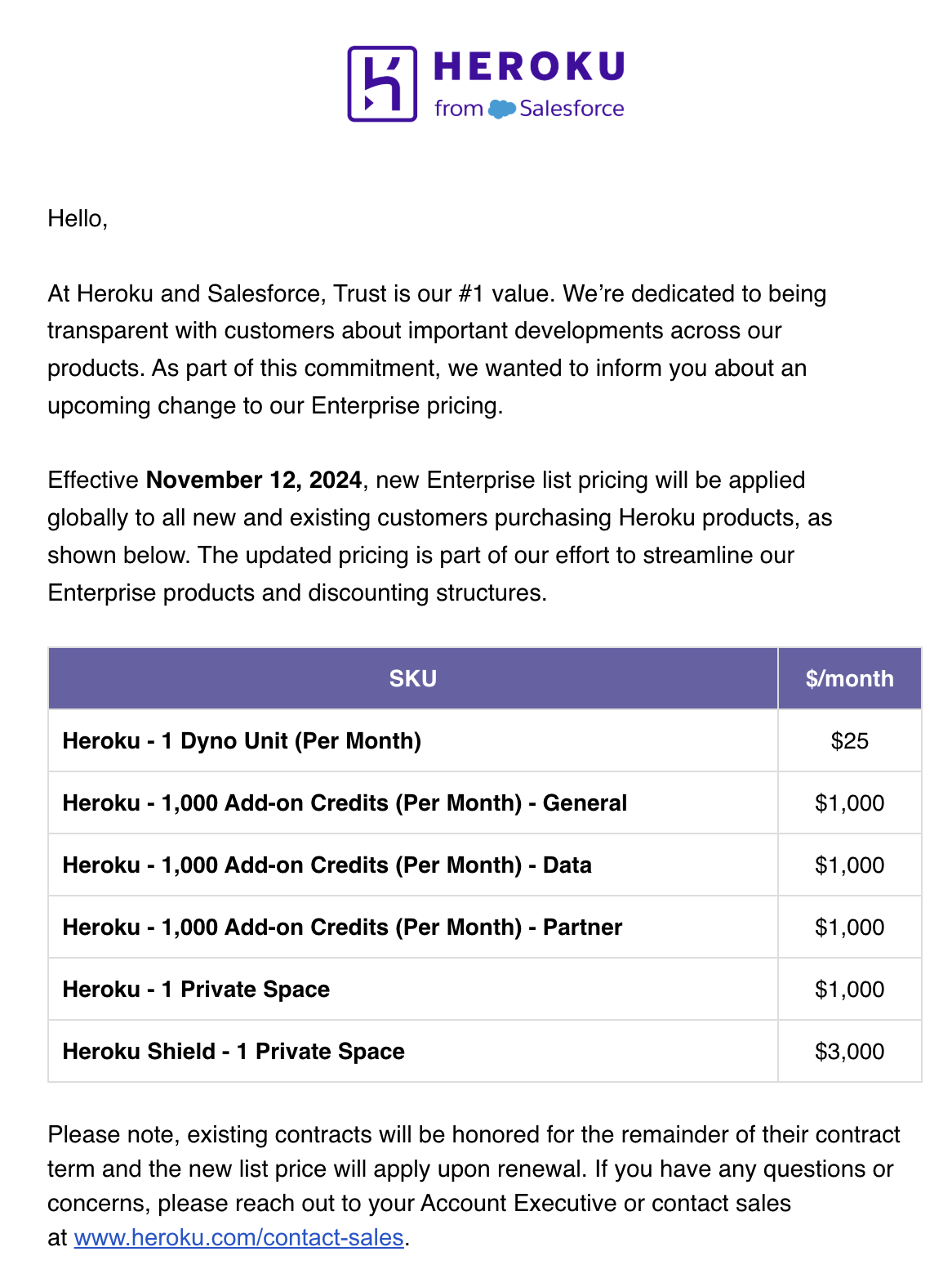 In May 2024, we received an automated email from Heroku. It informed us that the discounts on our containers were being rescinded, effective immediately. Naturally, we contacted Heroku’s support team to understand how that would affect our current contract and were redirected to a new account executive to clarify.